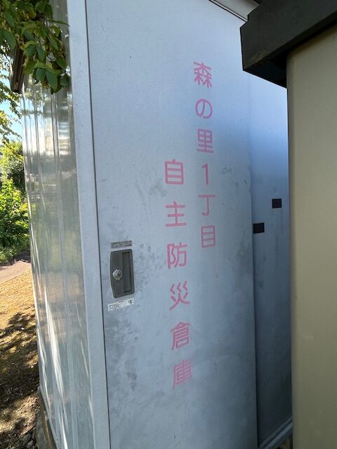 実際に、森小にある防災備蓄庫も見学していたそうです。そこで、今回は「備えあれば憂いなし」という話をしながら、一丁目の備蓄庫や備蓄品、そして安否確認訓練・避難所開設訓練・非常時対応訓練の様子などをスライドを使って説明しました。