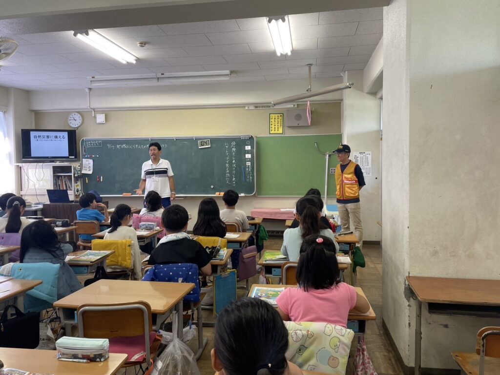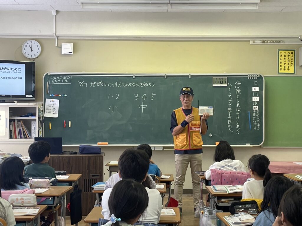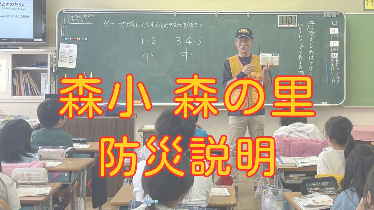 森小4年生 自主防災隊の備蓄と訓練9月17日(水)、森小4年生に「自治会の備蓄庫と訓練」の様子を説明しました。4年生は事前に、自然災害に備えるために何が必要かという学習を行っています。