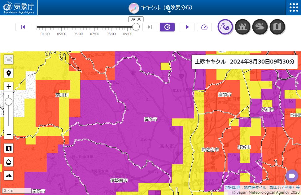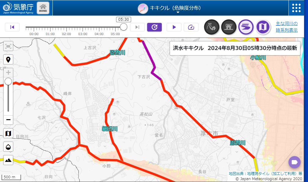 神奈川県の大雨情報はキキクル(危険度分布)で調べることができます。