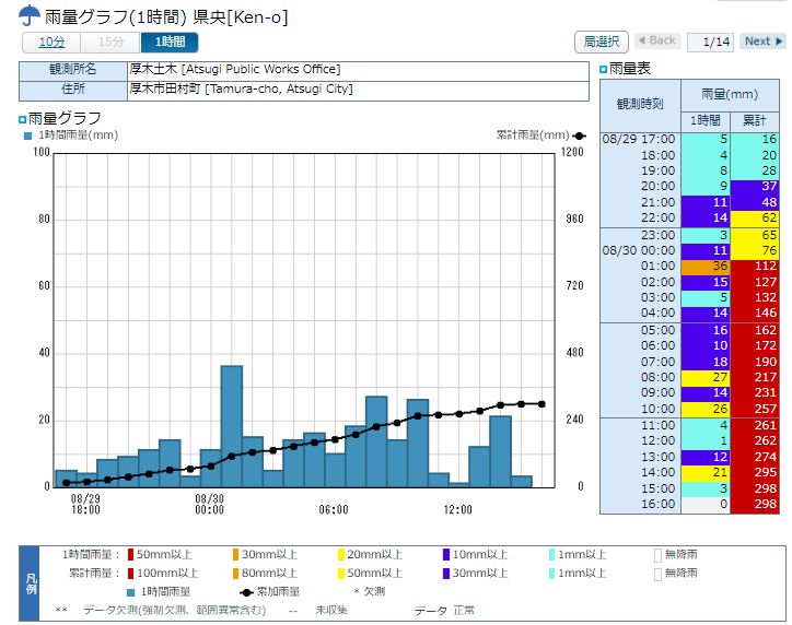 実際に降った雨量については、神奈川県雨量水位情報 雨量グラフ(1時間) 県央[Ken-o]のサイトが便利です。