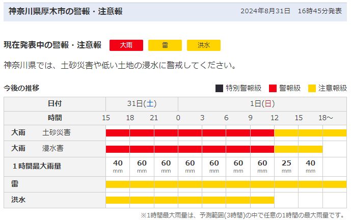 神奈川県厚木市の警報・注意報では明日1日(日)午前中まで継続になりました。