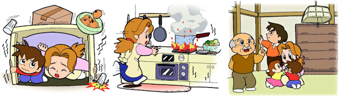 - 大きな揺れのときは,まず身を守ることが一番。揺れがいったん収まってから「火を消せ!」と声を掛け合って,調理器具や暖房器具などの火を消しましょう。