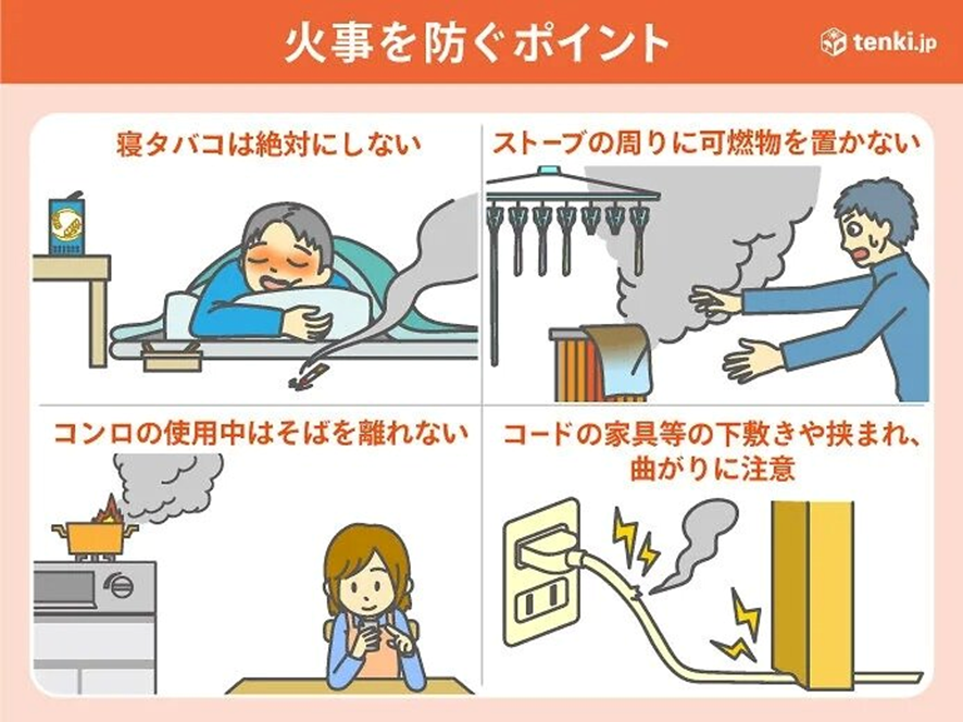 乾燥時は火災発生のリスクが高まり、わずかな火種でも出火・延焼するおそれがあります。乾燥注意報が発表されているときは、火災予防のため、次のような点に注意してください。