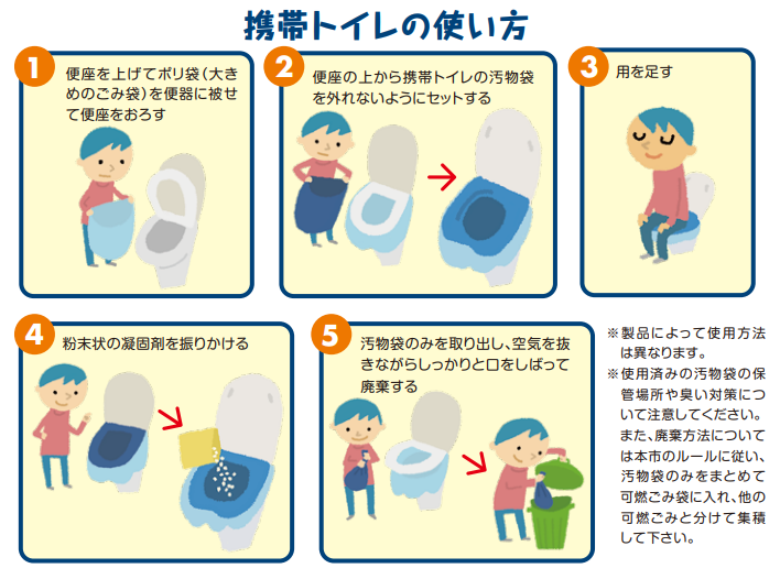 地震や台風などの大きな災害が発生すると、停電や断水、下水道施設の破損などが発生し、水洗トイレが使用できなくなることがあります。でも便器が壊れて使えなくなることはめったにありません。携帯トイレの使い方を覚えましょう。