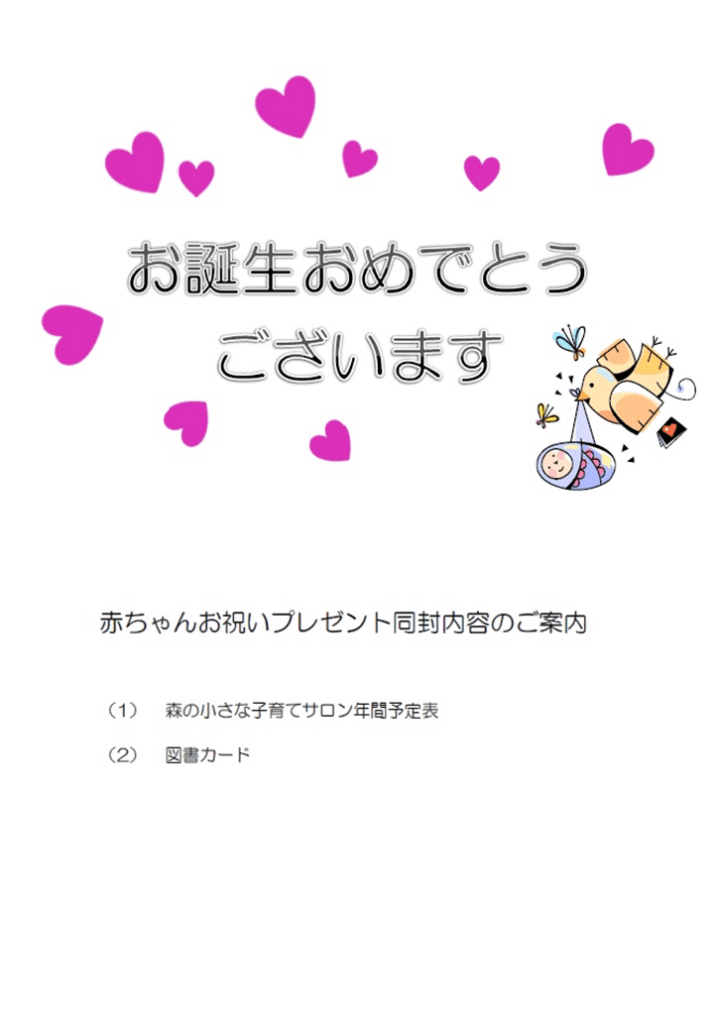 - 森の里在住の方で、1歳未満の赤ちゃんの保護者の方を対象に、お祝いキット(図書カード)をプレゼントします。